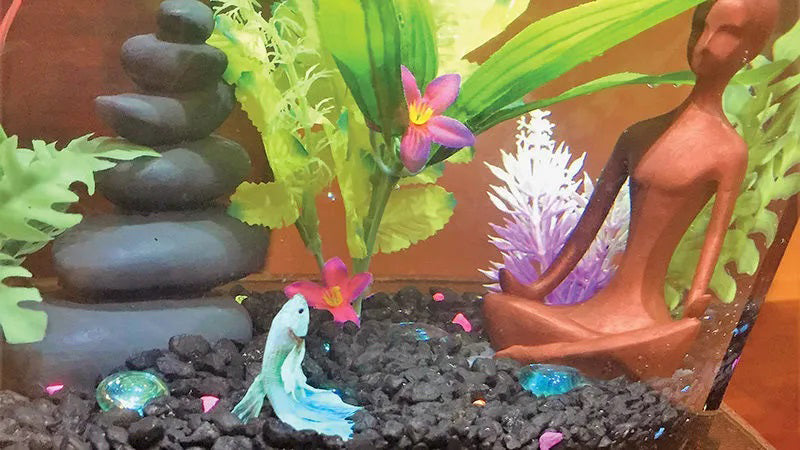 アメリカ・カリフォルニアに住むタミー。「自宅に私が愛するヨガや瞑想スペースを作っているの。飼っているホワイト・ベタのウィスパーの水槽にもね。写真は、モーニング・アーサナをしているウィスパーなの!」