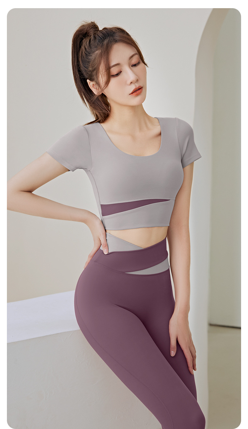 ヨガセット ヨガtシャツ +レギンス カップ付き 盛れる へそ出し 半袖 美尻 美脚 着圧 シームレス ヨガタイツ スポーツ フィットネス ジム ピラティス おしゃれ ストレッチ 快適 ハイウエスト 可愛い 大きいサイズ 全7色 S-XXL