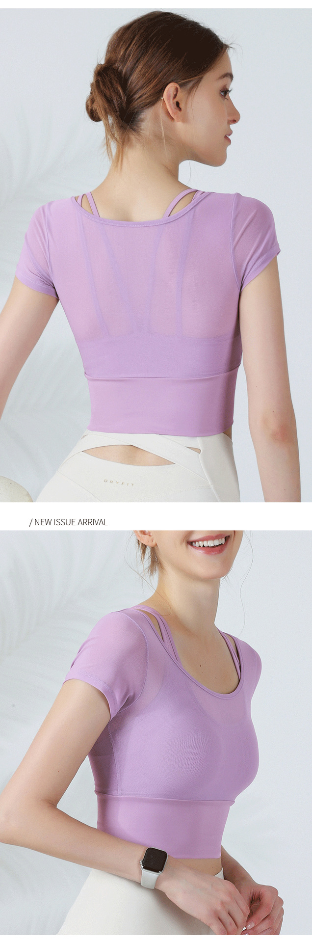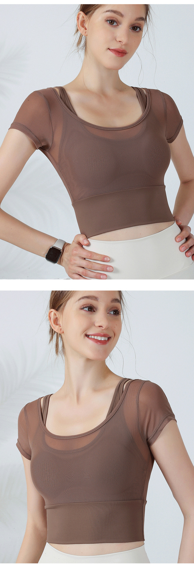 通気性のあるフェイク 2 ピース ピュア ラスト スタイル ホルターネック 胸パッド付き 半袖 ヨガ服 女性用 タイトフィット おへそ露出 痩身 スポーツ トップス